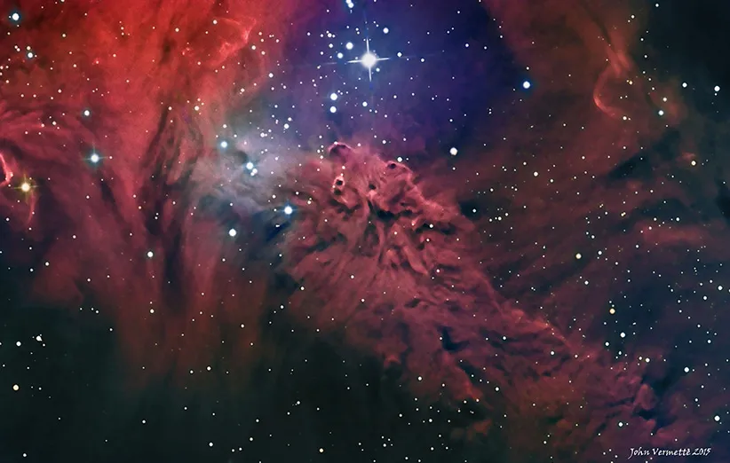 این روباه فضایی از غبار کیهانی و گازی که در اثر برخورد با نور و بادهای ستارهها برانگیخته شده، ساخته شده است. شکل، بافت ظاهر و رنگ این سحابی باعث شده که به آن نام «سحابی پوست روباه» (Fox Fur Nebula) بدهند. مناطق سیاه و قرمز، ترکیبی از غبار کیهانی و تابش قرمز رنگ از گاز هیدروژن یونیزه شده هستند. ستارهی خیلی پر نوری که در قسمت بالای عکس میبینید، «اس تکشاخ» (S Mon) نام دارد که یکی از ستارگان خوشهی ستارهای NGC 2264 است و در فاصلهی ۲۵۰۰ سال نوری از ما و در صورت فلکی تکشاخ قرار گرفته است. در قسمت مرکز رو به سمت چپ عکس منطقهای تقریبا آبی و بنفش دیده میشود که بازتاب کنندهی نور این ستاره است.