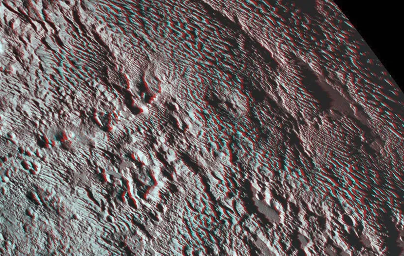 یک عینک سه بعدی با طلقهای قرمز و آبی درست کنید و با آن به این عکس نگاه کنید. عینکی که یک شیشهی آن آبی و دیگری قرمز است. این عکس از یک منطقهی کوهستانی روی سطح پلوتو به نام «تارتاروس دورسا» (Tartarus Dorsa) گرفته شده و میدان دیدی به عرض ۳۰۰ کیلومتر را نشان میدهد. فضاپیمای افقهای نو در ملاقات تاریخی سال گذشتهی خود با سیارهی کوتولهی پلوتو با فاصلهی ۱۴ دقیقه دو عکس با زاویهی دید اندکی متفاوت از این منطقه گرفت. اکنون این دو عکس را به شکلی با هم ترکیب کردهاند که بتوانید با زدن عینک سه بعدی قرمز/آبی آن را به شکل سه بعدی ببینید. تیغههای سطح این منطقه تا ۵۰۰ متر ارتفاع دارند و در فاصلهی ۳ تا ۵ کیلومتری از هم قرار گرفتهاند.