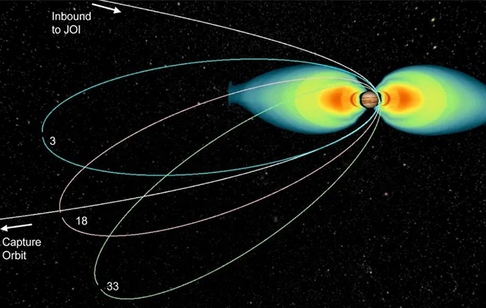 مدار جونو به شکلی است که برفراز قطبین مشتری پرواز میکند و در نتیجه میتواند پدیدههای جالب توجهی مثل شفقهای قطبی مشتری را ثبت کند.