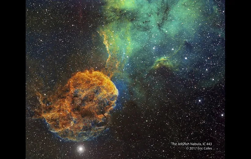 سحابی عروس دریایی کاملا کمنور و مرموز است ولی در عکس بالا میتوانید آن را خیلی پرنور مشاهده کنید. این سحابی در پایین سمت چپ عکس قرار گرفته و در پایین آن هم ستارهی اتا دوپیکر قابل مشاهده است. خود سحابی عروس دریایی در حقیقت قسمتی از باقیماندهی ابرنواختری IC 443 است؛ یک ابر غباری گسترشیابنده که از انفجار ستارهای بزرگ به جای مانده است. نور این انفجار اولین بار ۳۰ هزار سال پیش به زمین رسید. به نظر میرسد که درست مثل سحابی خرچنگ درون این سحابی هم یک ستارهی نوترونی قرار داشته باشد. ستارهای که باقیماندهی آن ستارهی پرجرم اولیه است. در بالا سمت راست عکس هم میتوانید یک سحابی نشری را به نام شارپلس ۲۴۹ ببینید. سحابی عروس دریایی تقریبا در فاصلهی ۵۰۰۰ سال نوری از ما قرار گرفته است. در این فاصله قطر عکسی که در بالا میبینید ۳۰۰ سال نوری است.