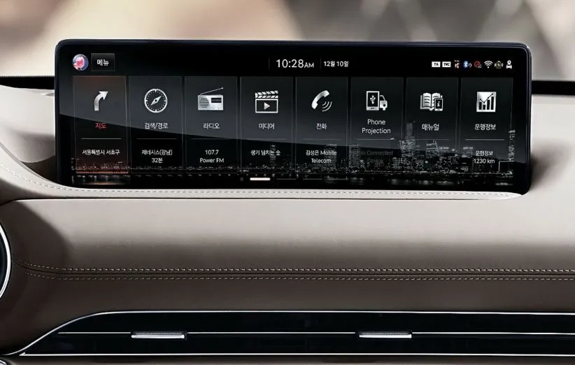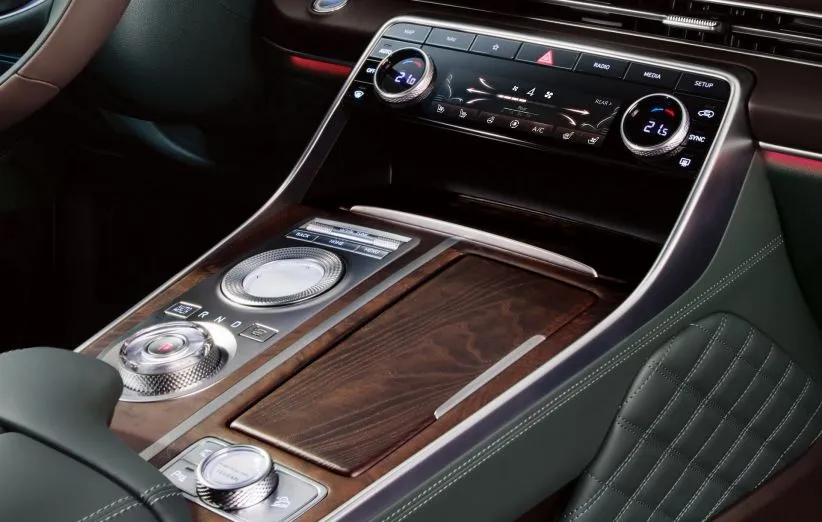جنسیس GV80 در داخل کابین حرفهای زیادی برای گفتن در برابر رقبا دارد، چرا که در ساخت بخشهای مختلف از مواد با کیفیت استفاده شده و آیتمهای زیادی در لیست امکانات و تجهیزات ایمنی آن دیده میشوند. در قسمت فوقانی داشبورد شکیل این خودرو، یک نمایشگر عریض 14.5 اینچی نصب شده است. برای دسترسی راحت به این نمایشگر و کنترل سیستم اینفوتینمنت، مهندسین جنسیس یک پد لمسی را در کنسول میانی تعبیه کردهاند. این پد به فناوری تشخیص دست خط مجهز بوده و راننده میتواند با نوشتن روی آن مثلا مقصد را برای سیستم مسیریاب تعیین کند.