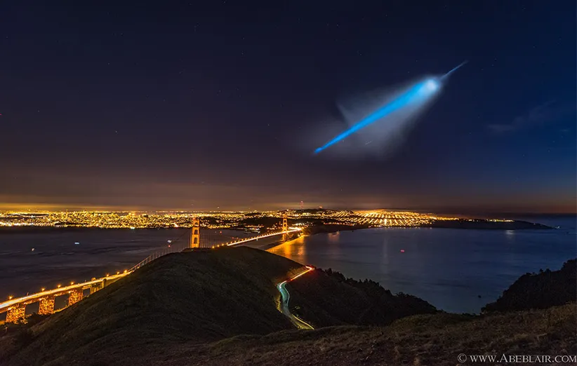 این نور عجیب و شبحوار در آسمان چیست؟ این نور، در آسمان حرکت میکرد و به تدریج بزرگ میشد. جالب اینکه درست موقعی ظاهر شد که عکاس این صحنه، در حال عکسبرداری از پل «گولدن گیت» در سانفرانسیسکو بود. افراد زیادی در کالیفرنیا توانستند این صحنه را ببینند. رصدگران با تجربهی آسمان شب، خیلی سریع بر روی اینکه این پدیده بازتاب نور خورشید از اثرات به جای ماندهی پرتاب موشک است، به توافق رسیدند. خبر خیلی زود توسط مقامات تایید شد و آنها گفتند که یک موشک هستهای «ترایدنت ۲ دی ۵» (Trident II D5) غیر مسلح را از یک زیردریایی پرتاب کردهاند. این پرتابها اصلا غیرمعمول نیستند ولی معمولا درست پس از غروب آفتاب و نزدیک به شهرهای بزرگ انجام نمیشوند؛ چرا که در این صورت مردم میتوانند اثر آن را مثل این پدیده ببینند.