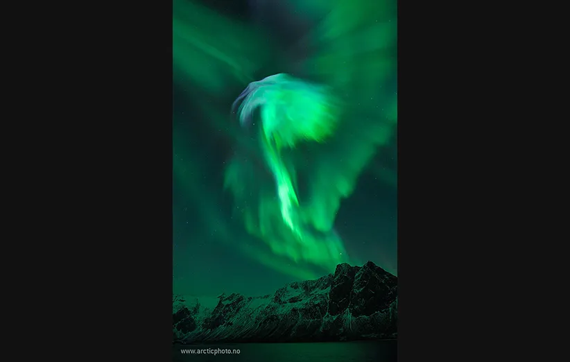 در آسمان چه اتفاقی میافتد؟ این عکس در سال ۲۰۱۲ گرفته شده و این درحالیست که درست پنج روز قبل از آن، «فوران تاج خورشیدی» رخ داده بود. این فوران باعث روانه شدن ابر بزرگی از الکترونها، پروتونها و یونهای پرسرعت به سوی زمین شد. هرچند بیشتر این ابر از کنار زمین عبور کرد، ولی قسمتی از آن به مغناطیسکرهی زمین برخورد کرد و این شفقهای قطبی زیبا که از عرضهای جغرافیایی بالا دیده میشود را بوجود آورد. در عکس بالا یکی از این شفقهای قطبی فتوژنیک را میبینید که برفراز نروژ پدیدار شده است. به نظر خیلیها این شفققطبی سبزرنگ شبیه به یک عقاب به نظر میرسد. هرچند که اکنون از بیشینهی فعالیتهای خورشیدی فاصله گرفتهایم ولی گاهی اوقات خورشید ما نشانههایی از فعالیت نشان میدهد و شفقهای قطبی زیبایی ایجاد میکند.