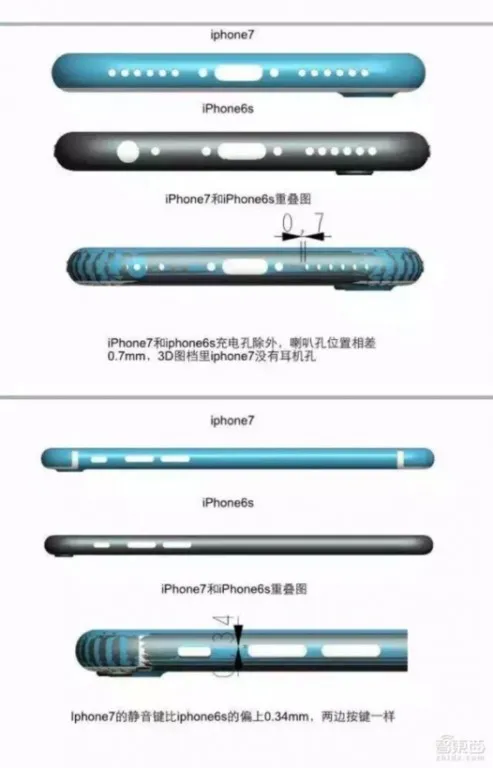 در این تصاویر آیفون 7 با مدل‌های قبلی مقایسه شده و به نظر می‌رسد که ضخامت کمتری نسبت به آیفون 6 و 6s دارد؛ اما به نظر می‌رسد که اندازه‌ی این گوشی‌ها تفاوتی با یکدیگر ندارند و صفحه نمایش آن‌ها هم یک اندازه است. همچنین در این تصاویر مشخص شده که محل قرار گرفتن دوربین پشت بزرگ‌تر شده که به احتمال زیاد برای دوربین دوتایی این گوشی خواهد بود. از همه مهم‌تر نبود جک 3.5 میلی‌متری خروجی صدا در این تصاویر کاملا مشخص است.