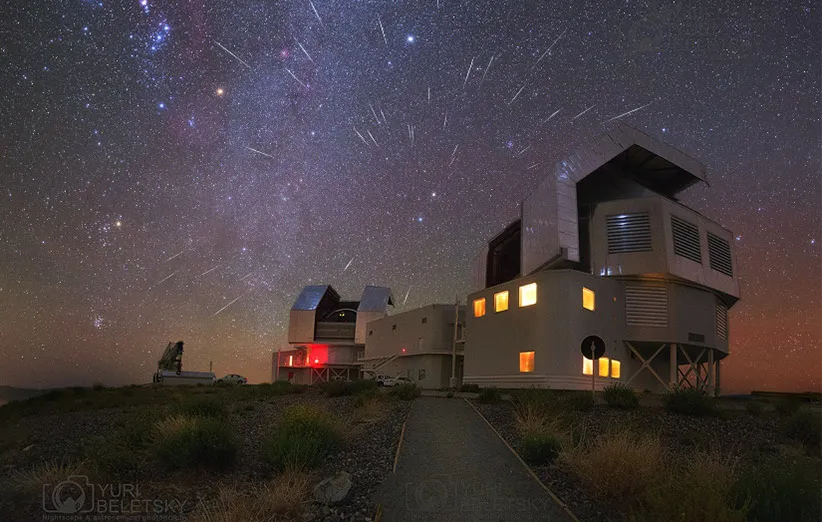 چند روز پیش، زمان اوج بارش شهابی جوزایی بود. رصدگران و عکاسان نجومی زیادی در سراسر دنیا برای تماشا و عکاسی از این پدیده شب را به صبح رساندند. این عکس در نیمکره‌ی جنوبی گرفته شده و به خوبی مشخص است که همه‌ی شهاب‌ها از سمت صورت فلکی دوپیکر و دو ستاره‌ی پرنور کستور و پلوکس به نقاط مختلف آسمان روانه می‌شوند. عکاس به مدت پنج ساعت پشت سر هم عکاسی کرده و سپس عکس‌هایی که در آن‌ها شهاب وجود داشته را روی یکدیگر قرار داده تا تصویری ترکیبی ساخته شود. به جز شهاب‌ها، در آسمان می‌توان پهنه‌ی راه‌شیری زمستانی و ستاره‌های صورت‌فلکی شکارچی که خیلی پرنور می‌درخشند را دید. از آسمان که بگذریم، در پیش‌زمینه‌ی این عکس می‌توان تلسکوپ‌های بزرگ ۶٫۵ متری ماژلان در کشور شیلی را مشاهده کرد.