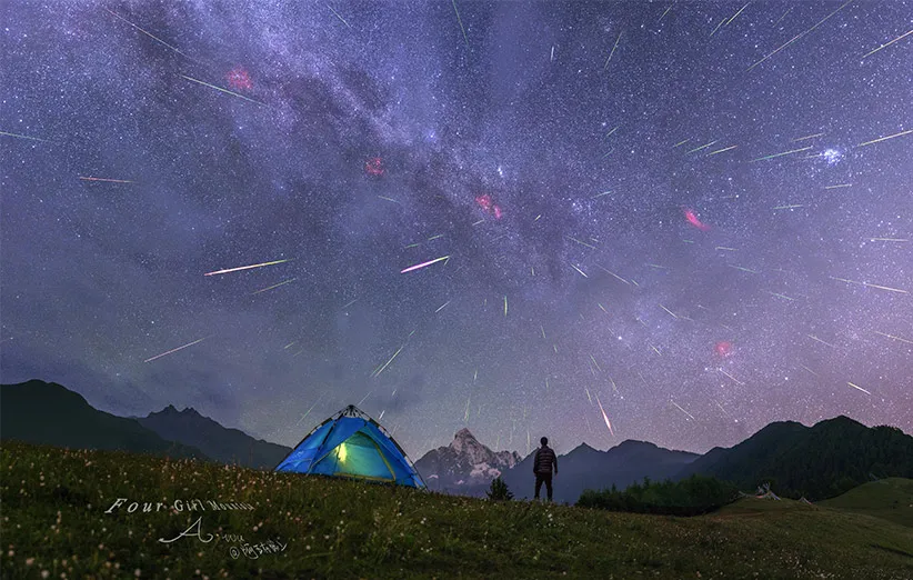 بعضی شب‌ها، از آسمان شهاب می‌بارد. طی یکی دو شب پیش رو زمین از گرد و غبار به جای مانده از یک سیارک گذر می‌کند و در نتیجه بارش شهابی جوزایی به اوج می‌رسد. البته امسال تماشای بارش شهابی مشکل‌تر است چون چهارشنبه ماه بدر در آسمان قرار دارد. عکس بالا در چین گرفته شده و شهاب‌های بارش برساووشی را برفراز کوه چهار دختر نشان می‌دهد. خوشه‌ی پرنور پروین سمت راست آسمان دیده می‌شود و سحابی‌های نشری متعدد قرمز رنگ در حالی که عموما در طول صفحه‌ی راه‌شیری قرار گرفته‌اند قطر عکس را طی کرده‌اند.
