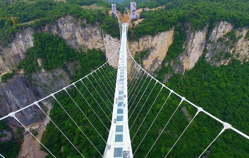 مرتفعترین و طولانیترین پل شیشهای معلق جهان ماه آینده در کشور چین افتتاح میشود. پیش از افتتاح این پل، مدیر پروژهی آن، از «دن سیمونز»، تهیهکنندهی برنامهی تلویزیونی خواست تا با پتک روی این شیشه بکوبد. همانطور که انتظار میرفت، پس از اولین ضربه، لایهی بالایی شیشه ترک خورد. اما مدیر پروژهی این پل از دن خواست که همینطور به ضربه زدن ادامه دهد. او هم چند بار همین کار را تکرار کرد. ظاهرا سازندگان این پل به این دلیل این کار را ترتیب دادند که چند ماه پیش شیشهی پل مشابهی در چین به دلیل افتادن یک ماگ از دست یک توریست شکسته بود. اینطور که پیداست، علیرغم ضربههای سنگینی که با پتک وارد شد، هیچ اتفاقی برای دو لایهی شیشهای دیگر که زیر آن قرار دارند، نیفتاد. شکستن این دو لایه غیر ممکن است. به این ترتیب، با اینکه ضربهها ظاهر شیشه را خراب کرد، اما هنوز کاملا سالم است.