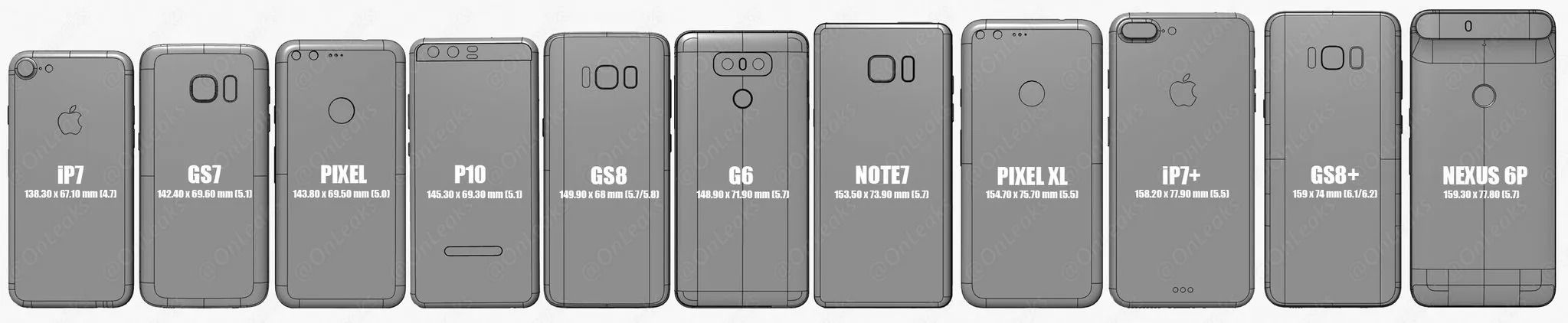 نسبت اندازه‌ی دیگر گوشی‌ها را هم می‌توان در این عکس دید. مثلا گلکسی S8 اندکی از ال‌جی G6 بلندتر ولی کاملا لاغرتر است. این عکس را یکی از کاربران مشهور توییتر که در کار لو دادن این جور مسائل و به قول خودش Tech Leak Star است منتشر کرده.