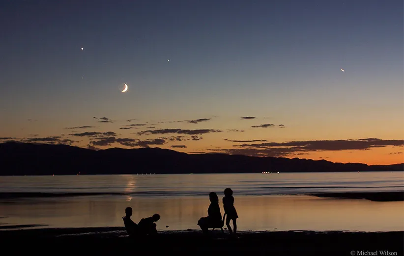 اوایل سپتامبر ۲۰۰۵ است و خورشید در کنار «دریاچه‌ی نمک بزرگ» ایالت یوتا، آرام آرام غروب می‌کند. بچه‌ها کنار مادر خود هستند و در آسمان، ماه، سه سیاره، یک ستاره و هواپیمایی در دوردست دیده می‌شود. بالا-سمت چپ ماه، سیاره‌ی درخشان زهره قرار گرفته است. در سمت راست آن نیز می‌توان سیاره‌ی مشتری را دید. پایین‌تر از زهره، ستاره‌ی سماک اعزل قرار گرفته است. آن خطی که سمت راست عکس دیده می‌شود، رد چراغ‌های یک هواپیما است. مادر بچه‌ها روی صندلی نشسته و پدربزرگ که از تماشای منظره لذت می‌برد، عکس را می‌گیرد. این هفته اگر پیش از طلوع آفتاب از خواب برخیزید، می‌توانید منظره‌ای مشابه را تماشا کنید.