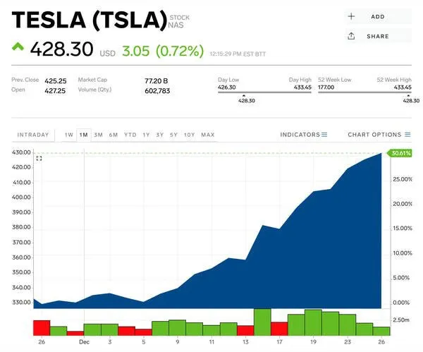 دسامبر: ارزش سهام تسلا به بیشترین حد در تاریخ این شرکت رسید!