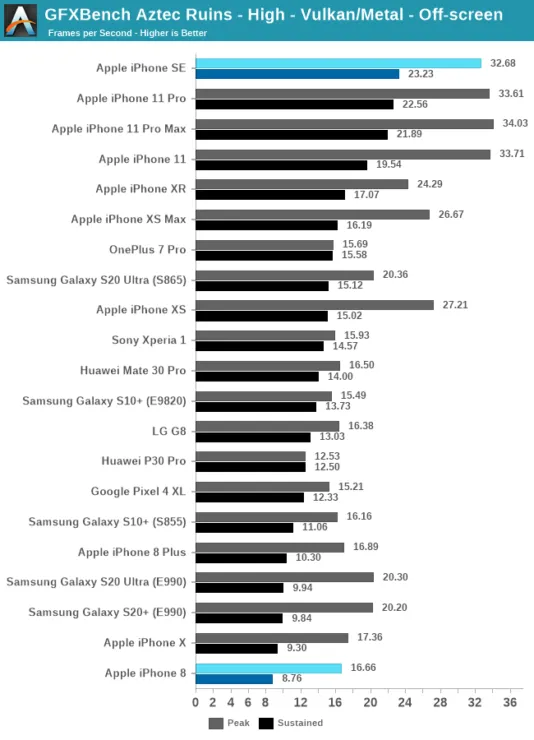 AnandTech طی بررسی که انجام داد، این محصول را با دیگر آیفونها و همچنین پرچمدارهای اندرویدی شرکتهای سامسونگ، هواوی، وان پلاس، سونی، ال جی، ایسوس و گوگل مقایسه کرد و در نهایت این آیفون SE بود که در صدر ایستاد! یعنی حتی آیفونهای 11 را هم در برخی تستها پشت سر گذاشت!