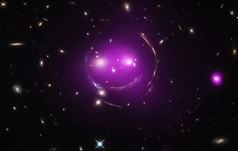 نظریهی نسبیت عام اینشتین دقیقا صد سال پیش در همین روزها ارائه شد. یکی از پیشبینیهای این نظریه، پدیدهای به نام عدسیهای گرانشی بود. در مرکز این عکس که در طول موجهای مرئی و ایکس با تلسکوپهای هابل و چاندرا گرفته شده، میتوانید یک عدسی گرانشی را مشاهده کنید. نوعی عدسی گرانشی که تصویر کهکشانهای پشت سر خود را کاملا کج و معوج کرده است. این عدسی گرانشی بر اثر تجمع مقدار خیلی زیاد ماده و مادهی تاریک یک گروه کهکشانی بوجود آمده و تصویر کهکشانها را به شکلی در آورده که گویی در حال تماشای چهرهی یک انسان هستیم. این کهکشانها با نام گروه کهکشانی «چشایر» (Cheshire) شناخته میشوند. دو کهکشانی که جای چشمهای این صورت قرار گرفتهاند، از پرنورترینهای این گروه هستند و میروند که با سرعتی در حدود ۱۳۵۰ کیلومتر بر ثانیه به یکدیگر برخورد کنند. به همین دلیل هم گازهای آنها کاملا گداخته شده و در پرتوی ایکس به شدت میدرخشند. کل این مجموعه در فاصلهی ۴.۶ میلیارد سال نوری از ما و صورت فلکی دب اکبر قرار دارد.