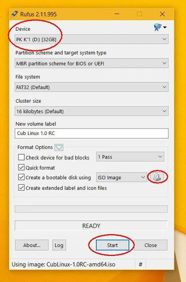 ۳- در قسمتی که عبارت «Create a bootable disk using» نوشته شده روی آیکون کوچک مربوطه کلیک کنید و فایل Cub Linux ISO را که دانلود کردهاید از هرجا که ذخیرهاش شده انتخاب کنید و دکمهی Open را بزنید.