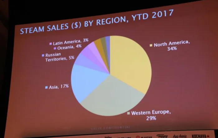 از نظر منطقهای، 17 درصد فروش بازیهای استیم از از چین، ژاپن، و کره هستند. 60 درصد کاربران این فروشگاه هم از ایالات متحده و اروپا هستند.