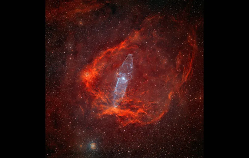 سحابی ماهیمرکب بسیار کم نور و در عین حال در آسمان ما کاملا بزرگ است. این سحابی با نام Ou4 هم شناخته میشود. در این تصویر یک سحابی دیگر به نام سحابی خفاش پرنده یا Sh2-129 هم وجود دارد. هردوی آنها در صورتفلکی سلطنتی قیفاووس قرار گرفتهاند. این عکس که با ۱۷ ساعت نوردهی و تلسکوپ مجهز به فیلتر Narrowband گرفته شده، میدان دیدی به اندازهی ۴ درجه یا ۸ ماه کامل را در بر گرفته است. سحابی ماهیمرکب در سال ۲۰۱۱ توسط یک عکاس نجومی فرانسوی به نام نیکولاس اوترز کشف شد. شکل دوقطبی آبیرنگ آن را به راحتی میتوانید در دل سحابی قرمز رنگ مشاهده کنید. تخمین فاصلهی سحابی ماهیمرکب تا حدودی مشکل است. بعضی مطالعات جدید میگویند که فاصلهی آن به زمین حدود ۲۳۰۰ سال نوری است. قطر آن هم به ۵۰ سال نوری میرسد. یکی از ویژگیهای خیلی جالب این سحابی، یک منظومهی ستارهای سهتایی است که در قلب آن قرار دارد.
