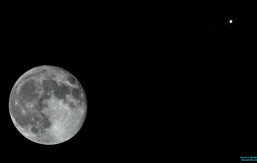 بعضی از بزرگترین قمرهای منظومهی شمسی شب ۲۳ فوریه با هم طلوع کردند. همان شب یک عکاس نجومی، عکس آنها را با هم گرفت. در این عکس میتوان یگانه قمر زمین یعنی ماه را دید و در گوشهی بالا سمت راست، سیارهی بزرگ مشتری و قمرهایش را مشاهده کرد. اگر به مشتری با دقت نگاه کنید، به راحتی میتوانید قمرهایش را ببینید. از سمت چپ به راست به ترتیب قمرهای «کالیستو» (Callisto)، «آیو» (Io)، «گانیمد» (Ganymede) و «اروپا» (Europa) قرار دارند. جالب است که کالیستو، آیو و گانیمد بزرگتر از ماه هستند. اروپا هم فقط کمی کوچکتر از ماه است. اگر تایتان قمر زحل را کنار بگذاریم، در این عکس ۵ تا از بزرگترین قمرهای منظومهی شمسی را میبینیم.