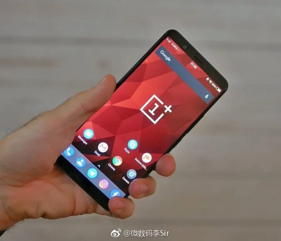 در این عکس میتوانید صفحه نمایش بزرگ و کم حاشیه گوشی را ببینید. شایعات میگویند که وانپلاس جدید به صفحه نمایشی با نسبت تصویر 18:9 مجهز شده است. همچنین سنسور تشخیص اثر انگشت گوشی به جای اینکه جلو باشد در پشت گوشی قرار گرفته است.