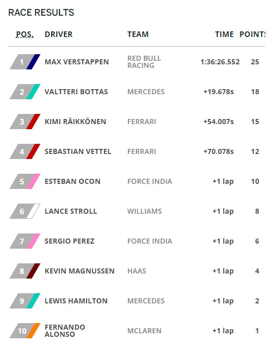 از نیمهی فصل جاری به قهرمانی مرسدس عادت کرده بودیم تا اینکه در آخرین مسابقه، تیم ردبول نتایج را به نفع خود عوض کرد. هجدهمین مرحله از مسابقات فصل 2017 فرمول یک در مکزیک برگزار شد. مکس فرشتپن از تیم ردبول توانست قهرمانی گرندپری مکزیک را از آن خود کند. در ادامه میتوانید جدول ردهبندی گرندپری مکزیک را ببینید: