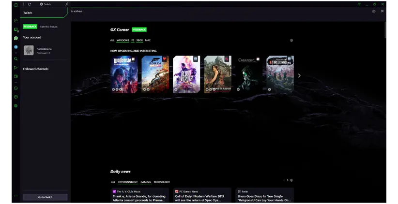 همانطور که در تصویر بالا مشاهده میکنید، یکی از گزینههای موجود در پنل سمت چپ مرورگر، به شما امکان دسترسی به وبسایت توییچ را میدهد که در آن میتوانید تمام کانالهایی را که دنبال کردهاید مشاهده کنید. همچنین میتوانید از طریق نوار اعلان مرورگر ببینید چه کسی مشغول استریم بازی است که برای یک مرورگر، همچین قابلیتی بسیار کاربردی و جذاب خواهد بود. علاوهبر توییچ، میتوانید شبکههای اجتماعی از قبیل تلگرام و واتساپ را نیز به منوی سمت چپ مرورگر اضافه کنید و پیامهای خود را از این طریق مدیریت کنید.