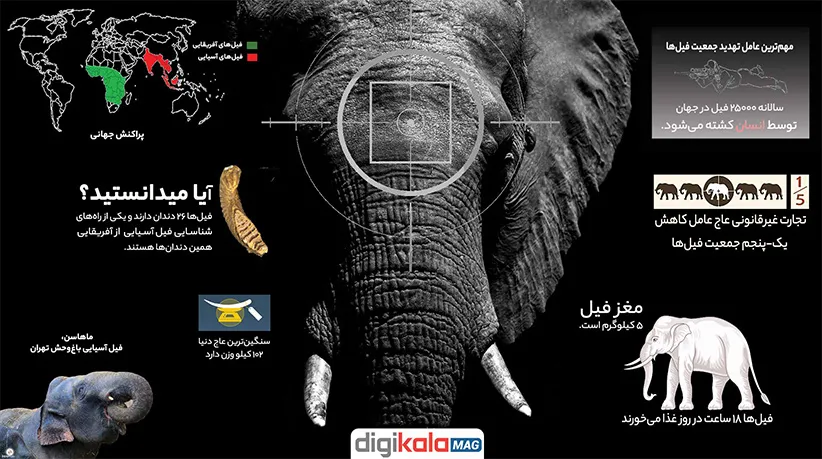 فیلها در میان تمام پستانداران طولانیترین دوره باروری را دارند. متوسط دوران بارداری در فیلها حدود ۶۶۰ روز تخمین زده شده است. واژه انگلیسی فیل (Elephant) از یک لغت یونانی به نام (elephas) که به معنی عاج است، گرفته شده. تجارت عاج فیل در دنیا وحشتناک است و یکی از مهمترین دلایل انقراض آنها به حساب میآید. کهنسالترین فیل دنیا ۸۶ سال عمر کرد اما طول عمر طبیعی فیلها بین ۵۰ تا ۷۰ سال است. بزرگترین فیل دنیا در کشور آنگولا شکار شد، ارتفاع شانههای این فیل از زمین ۳ متر و ۹۶ سانتیمتر بود. فیلها از آنها برای کندن زمین و به دست آوردن نمک، آب و ریشه گیاهان و گاهی هم برای حمله استفاده میکنند. خرطوم فیل در اصل حاصل پیوند بینی و لب بالایی است و به نوعی مهمترین عضو بدن آنها محسوب میشود. خرطوم به اندازهای قدرتمند و حساس است که میتواند حتی یک دانه برنج را به تنهایی بلند کند یا یک تنه درخت را به آسانی از ریشه دربیاورد. دندانهای دراز فیلها در اصل جزو دندانهای پیشین آنهاست که در تمام طول مدت عمر فیلها رشد میکند. برخی منابع میزان رشد دندانهای پیشین را در حدود ۱۷ سانتیمتر بیان کردهاند. اما آیا فیلها فقط همین دو دندان را دارند؟ پاسخ این سوال و نکات ابتدایی دیگر در مورد فیلها را در تابلوی اینفوگرافیک ما ببینید.