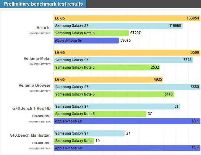 در حال حاضر، نتایج آزمون AnTuTu این دو گوشی منتشر شده و این طور که به نظر میرسد، الجی G5، یا به عبارت دیگر، تراشهی Snapdragon 820، کمی سریعتر از گلکسی S7 یا همان تراشهی Exynos 8890 است.