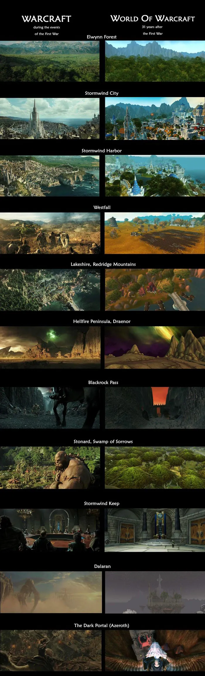 وبسایت «کوتاکو» (Kotaku) تصاویری منتشر کرده که در آن طراحی لوکیشنهای مهم بازی دنیای وارکرفت در بازی و فیلم با هم مقایسه شدهاند.