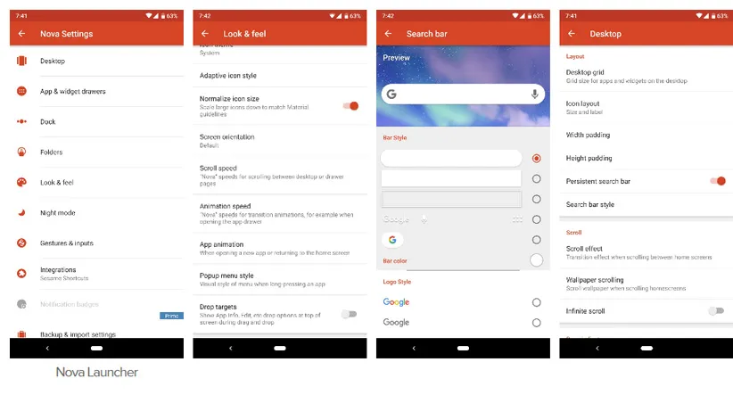 Nova Launcher طرفداران پروپاقرص زیادی دارد که بخشی از آن به قابلیتهای شخصیسازی گستردهای برمیگردد که این لانچر در اختیار کاربران قرار میدهد. در هوم اسکرین، میتوانید اندازه کلی «گرید» (grid)، اندازه آیکونها، افزودن نوار جستجو و حتی استایل و لوگو نوار جستجو را مشخص کنید. تمام این کارها و بسیاری از کارهای دیگر، فقط مربوط به بخش هوم اسکرین است که در بخشهای دیگر رابط کاربری میتوان کارهای متنوع دیگری هم انجام داد.