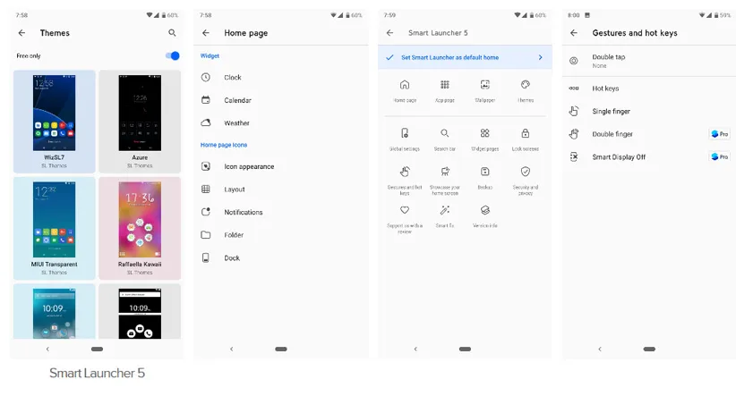 Smart Launcher هم تمهای مختلفی ارائه میدهد که میتوانید از بین آنها دست به انتخاب بزنید. البته تعداد آنها چندان زیاد نیست و از لحاظ قابلیتهای متنوع هم قابل مقایسه با تمهای Buzz Launcher نیستند. در نسخهی رایگان میتوانید تغییرات محدودی را اعمال کنید اما برای تغییرات بیشتر مانند ژستهای حرکتی، افزودن ویجتها، افزایش قابلیتهای نوار جستجو، باید نسخهی پولی آن را خریداری کنید.