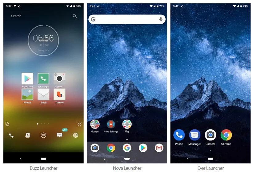 لانچرهای Nova، Evie و Lawnchair رویکرد «بوم خالی» را اتخاذ کردهاند. به غیر از بخش داک، هوم اسکرین لانچر Nova حاوی دو پوشه برای اپلیکیشنهای گوگل و اپلیکیشن تنظیمات این لانچر است. لانچر Evie از این هم سادهتر است و در هوم اسکرین آن فقط شاهد 4 اپلیکیشن هستیم.