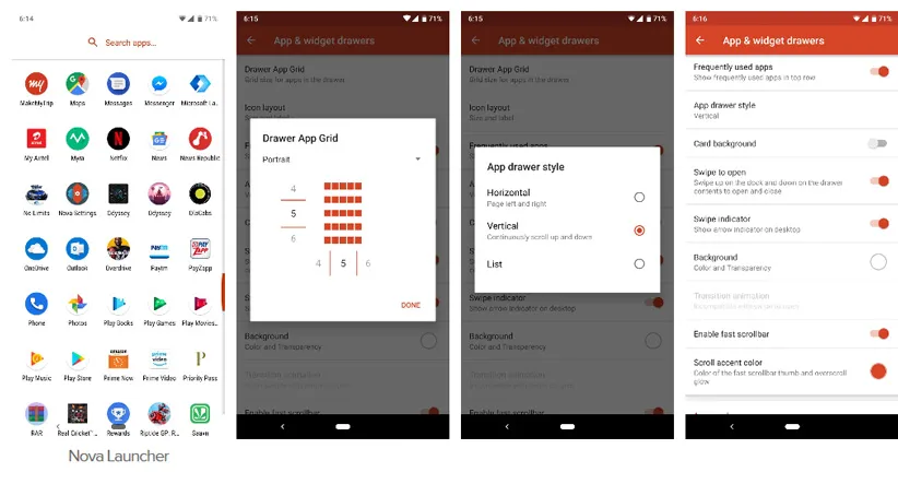 در نگاه اول، لانچر Nova از یک app drawer استاندارد و معمولی بهره میبرد. اما در بخش تنظیمات، میتوانید ظاهر این بخش را تغییر دهید. بهعنوان مثال، امکان تنظیم اندازه ردیفها و ستونهای اپلیکیشنها، نمایش اپلیکیشنهایی که مرتباً استفاده میشوند و باقی تنظیمات اینچنینی وجود دارد. تمام این تنظیمات در نسخهی رایگان این لانچر قرار دارند و با پرداخت مبلغ موردنظر و خرید نسخه پولی، تنظیمات پیشرفتهتری ارائه میشود.