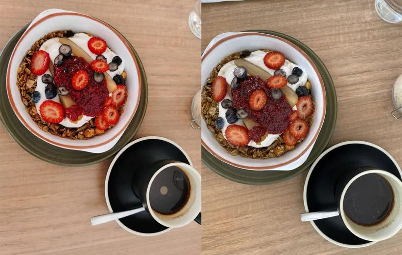 با این اوصاف هواوی توانست میزان تعادل در رنگها را در میت 30 پرو به نسبت P30 پرو افزایش دهد. با نگاهی به تصویر زیر، به خوبی میتوان توضیحات بالا را در تفاوت بین رنگهای گرانولا مشاهده کرد. اشباع رنگها به شکلی است که شاید با یکبار دیدن آن، محصور زیبایی و طراوت عکس شوید! اما خب این اشباع بیش از حد، توتفرنگیها را از حالت طبیعی بیرون آورده و حتی خطوط روی میز را هم به همین خاطر محو کرده است. در طرف دیگر اما تصاویر آیفون 11 پرو شاید در نگاه اول کمی دلگیر کننده به نظر برسند، اما کنترل رنگها به بهترین شکل ممکن صورت گرفته و خطوط روی میز نیز به خوبی آشکار است.