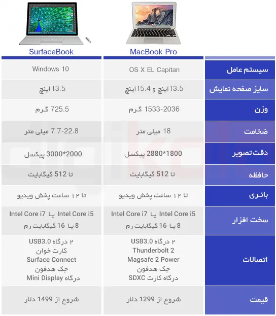 در ادامه لپتاپ سرفیس بوک را با مکبوک پرو شرکت اپل مقایسه کردهایم. با نگاهی به سختافزار این محصولات میتوان به قدرت هرکدام پیبرد.