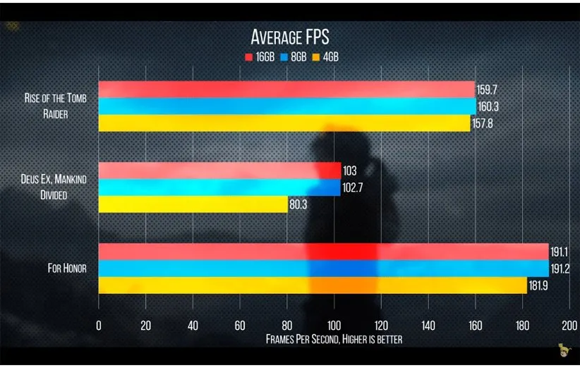 اما اگر بخواهید تاثیر رم را در بازیها متوجه شوید، به بنچمارکهای زیر نگاهی بیاندازید. مقادیر 4، 8 و 16 گیگابایت در این بنچمارک مورد بررسی قرار گرفتند تا ببینیم عملکرد آنها در بازیهای مختلف چگونه است و آیا ارزش دارد رم را ارتقا دهیم یا خیر! در این مقایسه عملکرد این سه میزان رم در بازیها روی کیفیت 1080P بررسی میشود.