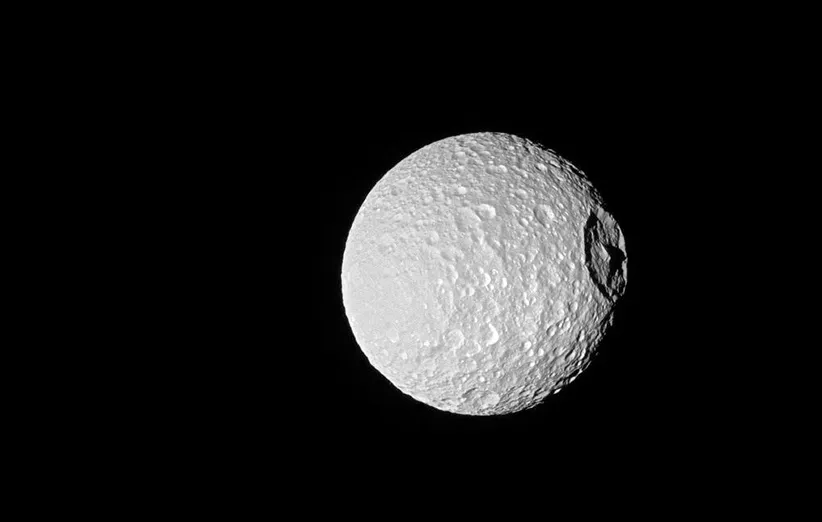 میماس یک قمر یخی و پر از دهانه‌ی برخوردی متعلق به زحل است که در حدود ۴۰۰ کیلومتر قطر دارد. بزرگترین دهانه‌ی آن که هرشل نام دارد قطرش تقریبا به ۱۴۰ کیلومتر می‌رسد. این دهانه که اندازه‌اش تقریبا یک‌سوم خود قمر است باعث شده که میماس ظاهری شوم پیدا کند. در حقیقت اگر برخوردی که این دهانه را بوجود آورده فقط اندکی بزرگتر بود می‌توانست کل قمر را نابود کند. این عکس را فضاپیمای کاسینی در اکتبر سال ۲۰۱۶ گرفته قسمتی از قمر را نشان می‌دهد که دائما در معرض نور خورشید قرار دارد. آن قله‌ای که در وسط دهانه‌ی هرشل می‌بینید به اندازه‌ی اورست ارتفاع دارد.