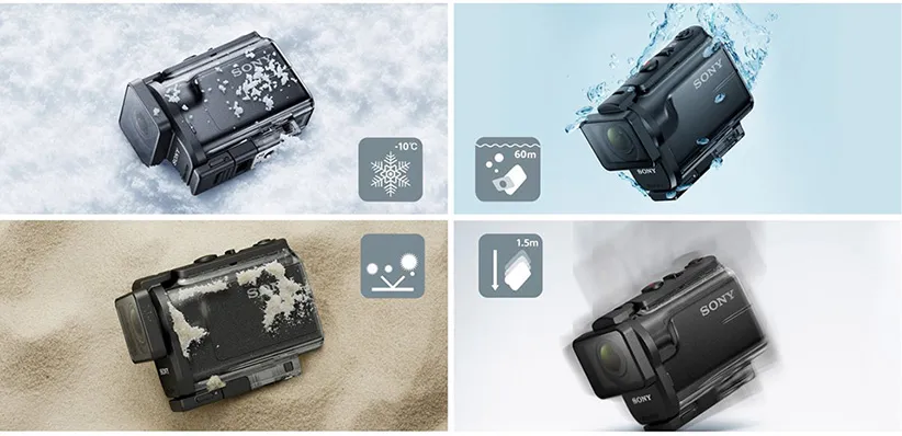 رطوبت همیشه اولین خطری است که یک دیوایس الکترونیکی را تهدید می‌کند. با پوششی که سونی برای این دوربین طراحی کرده نه تنها هیچ نگرانی از بابت نفوذ رطوبت وجود نخواهد داشت، بلکه می‌توان تا عمق ۶۰ متری از سطح آب با دوربین فیلمبرداری کرد. حالا می‌توانیم غواصی را نیز به لیست ورزش‌های هیجان‌انگیزمان اضافه کنیم. تهدید دیگر دیوایس‌های الکترونیکی به ویژه ابزارهای نوری مانند دوربین و لنز گرد و غبار است. ساحل، کویر یا حتی محیط‌های شهری، مملو از دانه‌های شن و ماسه و ریزگردهای مختلفی است که می‌تواند برای دوربین ما خطرناک باشد. این پوشش که با نام Underwater Housing (MPK-UWH1) شناخته می‌شود در مقابل این خطر هم از دوربین دوست‌داشتنی سونی مراقبت می‌کند. نکته‌ی بعدی برودت هواست که در حالت شدید خود می‌تواند برای وسیله‌ای مانند این دوربین خطرساز باشد. تا وقتی که دماسنج از دمای منفی ۱۰ درجه عدد پایین‌تر را نشان ندهد، می‌توانید از بابت سلامت دوربین خود خاطرجمع باشید. حتی اگر این دوربین برای همراهی با حرکت‌های سریع و هیجان‌انگیز هم طراحی نشده بود، ضربه و سقوط مانند هر دیوایس دیگری تهدید بزرگی برای آن به شمار می‌رفت. اما با این پوشش شفاف سونی خیال خودش و شما را از بابت ضربه‌های معمول و سقوط از ارتفاع حداکثر یک ‌و نیم متری راحت کرده است. حالا دیگر می‌دانیم که با همراهی سرسخت و مستحکم در اتفاقات هیجان‌انگیز زندگی‌مان همراه هستیم.