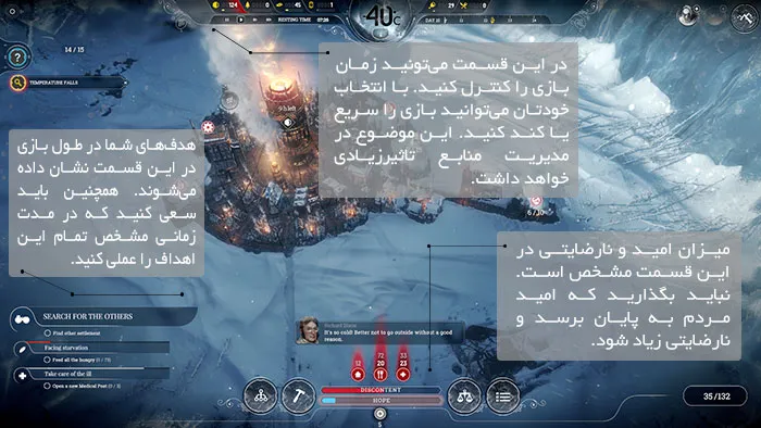 باید به این موضوع هم اشاره کنم که در طول بازی با کمبود نیروی کار هم مواجه می‌شوید. اینجاست که می‌توانید دیدبان‌های خودتان را به سرزمین‌های اطراف بفرستید تا آن‌ها انسان‌های گم شده را پیدا کنند. اما به این موضوع توجه داشته باشید که اضافه شدن افراد بیشتر به شهرتان باعث می‌شود که منابع بیشتر مصرف شوند و مدیریت درخواست مردم هم بسیار سخت می‌شود. اضافه شدن هر فرد جدید به سرپناه، غذا و گرمای بیشتر نیاز دارد. پس نباید بدون فکر جمعیت را زیاد کنید. به این فکر کنید که باید از زندگی تمام این مردم محافظت کنید. آن‌ها آمده‌اند که در این شهر زنده بمانند و این شما هستید که باید آن‌ها را با تصمیم‌های خودتان زنده نگه‌دارید.