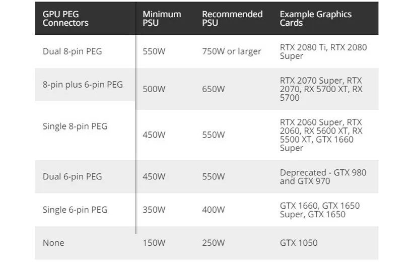 یکی از مهمترین فاکتورها قبل از خرید کارت گرافیک جدید، محاسبه توان مصرفی آن است تا ببینید آیا پاور سیستم میتواند برق مورد نیاز آن را تامین کند یا خیر. در حال حاضر اگر به فکر ارتقای گرافیک خود هستید تا بتوانید بازیهای روز را با حداقل تا بهترین جزئیات ممکن تجربه کنید، به یکی از این گرافیکهای یاد شده در لیست زیر نیاز خواهید داشت که توان پاور مورد نیاز آنها نیز در بخش Recommended PSU نوشته شده است.