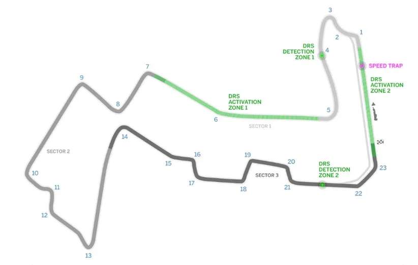 پیست گرندپری سنگاپور، Marina bay نام دارد که یک پیست خیابانی است. فضای این پیست در شب، زیبایی خیرهکنندهای دارد. طول یک دور مسابقه 5 کیلومتر و 65 متر است که با احتساب 61 دور کامل برای به پایان رساندن مسابقه، به مسیر کلی ۳۰8٫828 کیلومتر میرسد. دنیل ریکاردو در سال 2016 موفق شد سریعترین دور مسابقه را ظرف یک دقیقه و 47 ثانیه و 187 هزارم ثانیه بزند. در ادامه میتوانید تصویری از مسیر نقشهی گرندپری سنگاپور را ببینید: