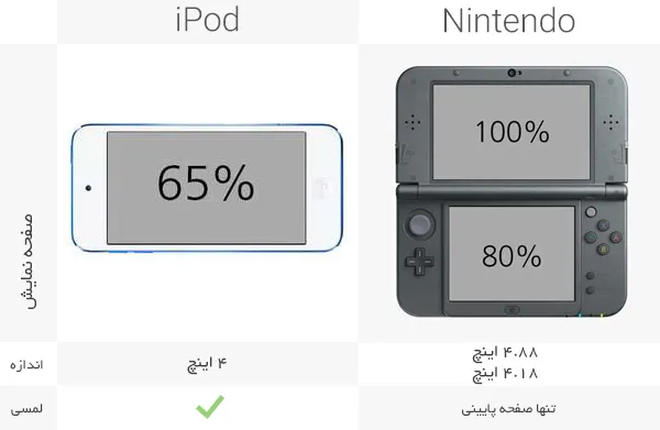 اندازهی بزرگ 3DS XL بهخاطر صفحهی نمایش بزرگاش است. این دستگاه دو صفحهی نمایش دارد که هر دوی آنها هم از آیپاد تاچ بزرگتر هستند.