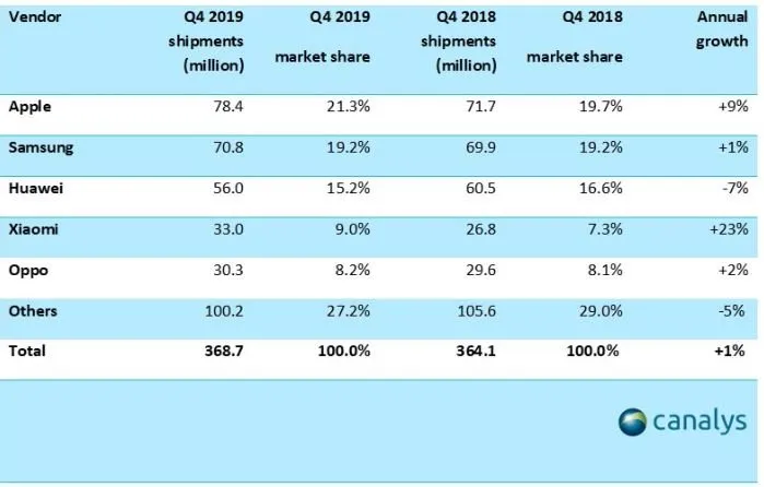 با استناد به گزارش Canalys، آمار فروش ۲۴۰.۶ میلیون دستگاه در سال ۲۰۱۹ میلادی برای هواوی ثبت شده است. تحلیلگران Canalys معتقدند بر پایه این آمار و ارقام، هواوی ۱۷.۶ درصد از سهم بازار را در اختیار دارد. میزان فروش هواوی در سال ۲۰۱۸ میلادی، ۲۰۶ میلیون دستگاه اعلام شده بود. در این گزارش هم هواوی در جایگاه دوم و بالاتر از اپل است. بر اساس آمار و ارقام Canalys، هواوی در سه ماهه چهارم سال ۲۰۱۹ میلادی، ۵۶ میلیون دستگاه گوشی هوشمند فروش داشته.