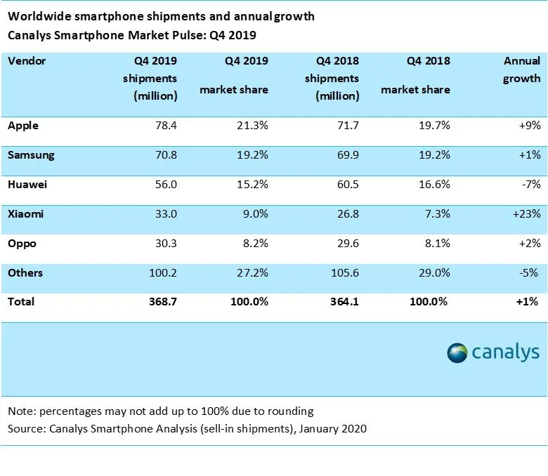 بر اساس آمار منتشر شده عرضه گوشیهای هوشمند به بازار کاهش ۱.۱ درصدی داشته، در حالی که با در نظر گرفتن بازه سه ماهه پایانی، افزایش ۲.۹ درصدی میزان فروش در سال ۲۰۱۹ میلادی به ثبت رسیده است. بر اساس گزارش Counterpoint، در مجموع در سال ۲۰۱۹ میلادی ۱۴۸۶.۱ میلیون دستگاه گوشی هوشمند به فروش رفته که سهم هواوی از این مجموع، رقم قابل توجه ۲۳۸.۵ میلیون دستگاه است.