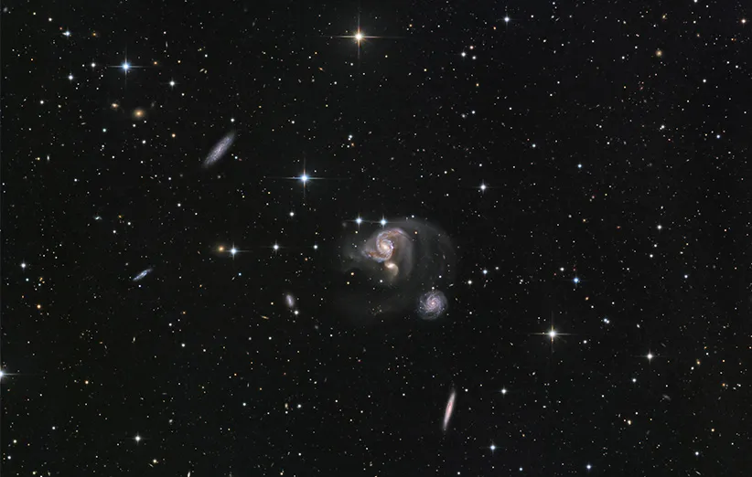 این گروه کهکشانی که HCG 91 نام دارد را ستارهشناسی کانادایی به نام پال هیکسون و همکارانش کشف کردهاند. آنها در کل ۱۰۰ گروه کهکشانی فشرده مانند این یکی را پیدا کردهاند و نام آنها را «گروههای فشردهی هیکسون» (HCG) گذاشتهاند. در مرکز عکس میتوانید سه کهکشان مارپیچی را ببینید که در برهمکنش گرانشی شدید با یکدیگر هستند. درگیری گرانشی آنها باعث بوجود آمدن دنبالههای کشندی کمنور ولی مشخصی شده که ۱۰۰ هزار سال نوری طول دارند. برهمکنش گرانشی نزدیک این کهکشانها باعث بوجود آمدن زنجیرهای از زایشهای ستارهای شده است. در نهایت هم طی میلیاردها سال این کهکشانها با یکدیگر ادغام میشوند تا کهکشان بزرگتری را بوجود آورند. اکنون میدانیم که ادغام شدن کهکشانها پدیدهی نادری نیست و کهکشان راهشیری ما هم تجربهی مشابهی داشته است. HCG 91 در فاصلهی ۳۲۰ میلیون سال نوری از ما در صورت فلکی حوت جنوبی قرار گرفته است.