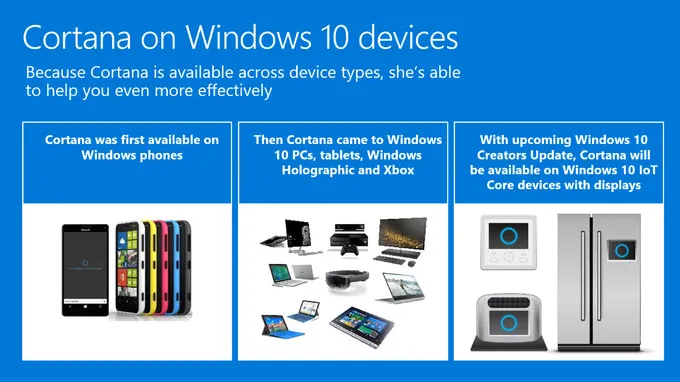 مایکروسافت قصد دارد کورتانا را روی وسیلههای متفاوت قرار دهد. حتی گفته شده که بهروزرسان Windows 10 Creator’s Update بسیاری از قابلیتهای اینترنت اشیا را معرفی میکند. کاملا مشخص است که مایکروسافت با ویندوز 10 قصد دارد به تمام حوزهها وارد شود. این سیستم عامل قرار است روی گوشیها، کامپیوترهای مختلف و لوازم خانگی استفاده شود.