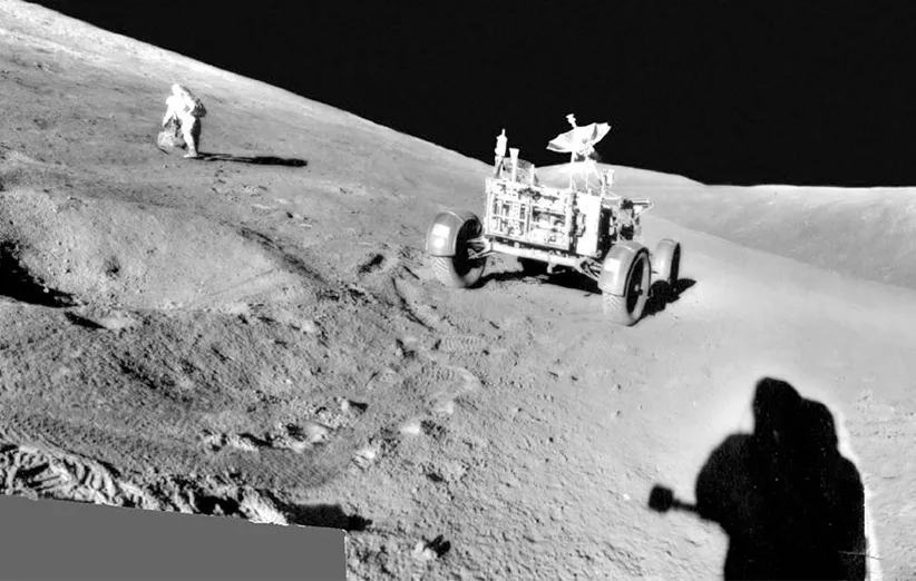 در ۳۱ جولای ۱۹۷۱، فضانوردان آپولو ۱۵ به نام «جیم ایروین» و «دیو اسکات» اولین خودروی ماه‌نورد را روی این قمر آزمایش کردند. آن‌ها سوار بر این خودرو به مدت سه روز ۲۸ کیلومتر را طی کردند و در سطح ماه به جستجو پرداختند. این عکس پانوراما دیو اسکات را در حال آزمایش بر روی یک تخته سنگ در منطقه‌ی «هادلی-آپنین» (Hadley-Apennine) ماه نشان می‌دهد. خودروی ماه‌نورد هم در سمت راست او قرار دارد. سایه‌ی پایین عکس متعلق به جیم ایروین است. ماموریت آپولو ۱۵ با خود ۷۶ کیلوگرم از سنگ‌های ماه را به زمین بازگرداند.