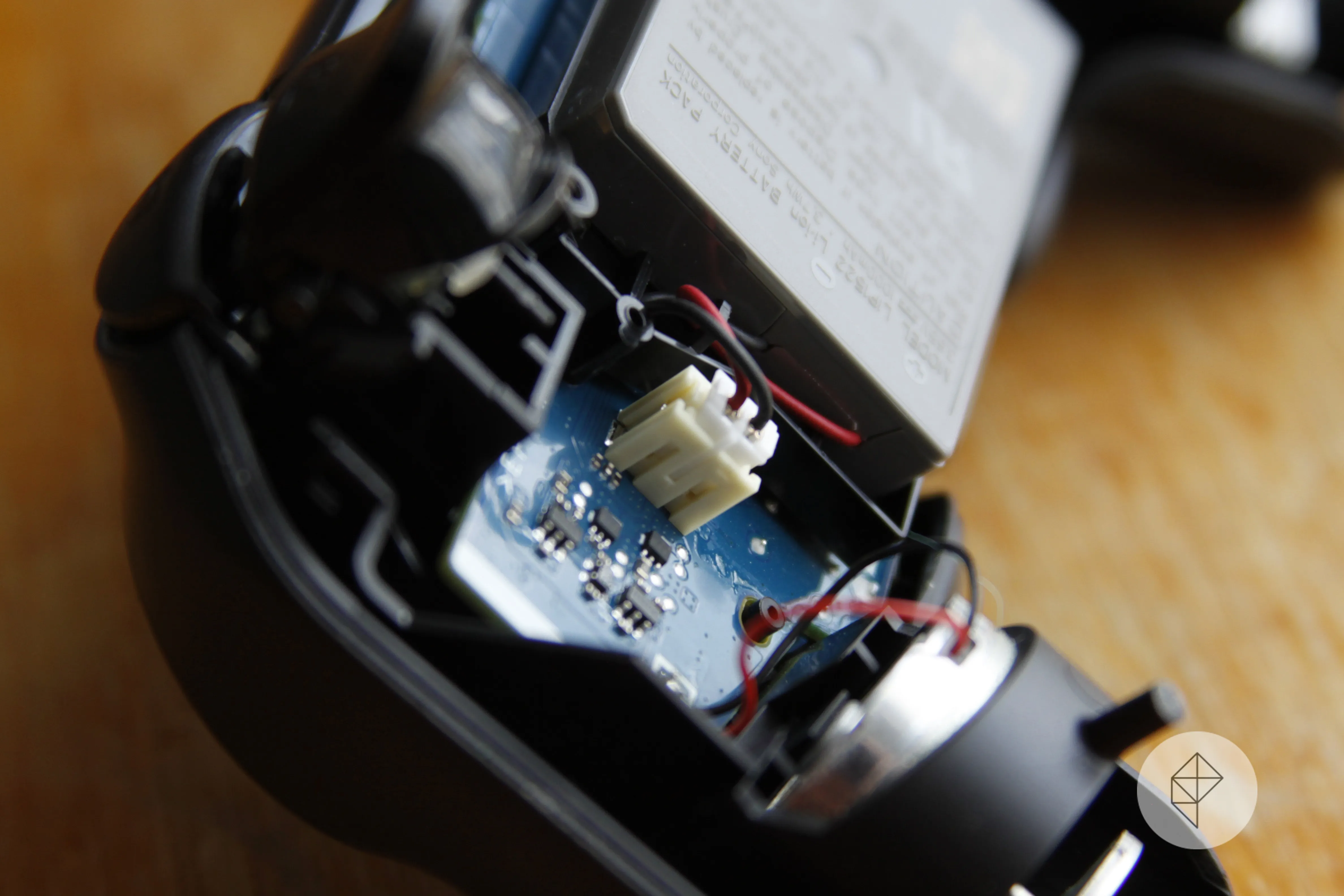 قسمت پایینی دسته را دیگر به کنار بگذارید. در مقابل خودتان باتری دسته را میبینید. با استفاده از انگشت و شستتان، کانکتور باتری را در بیاورید. حواستان باشد که سیمها را نکشید. اتصال دوبارهی باتری هیچ کاری ندارد و غیرممکن است که کانکتور آن را اشتباه وصل کنید. با این حال، در نظر داشته باشید که اگر اشتباه وصل شود، اتفاقات زیبایی رخ نخواهد داد.