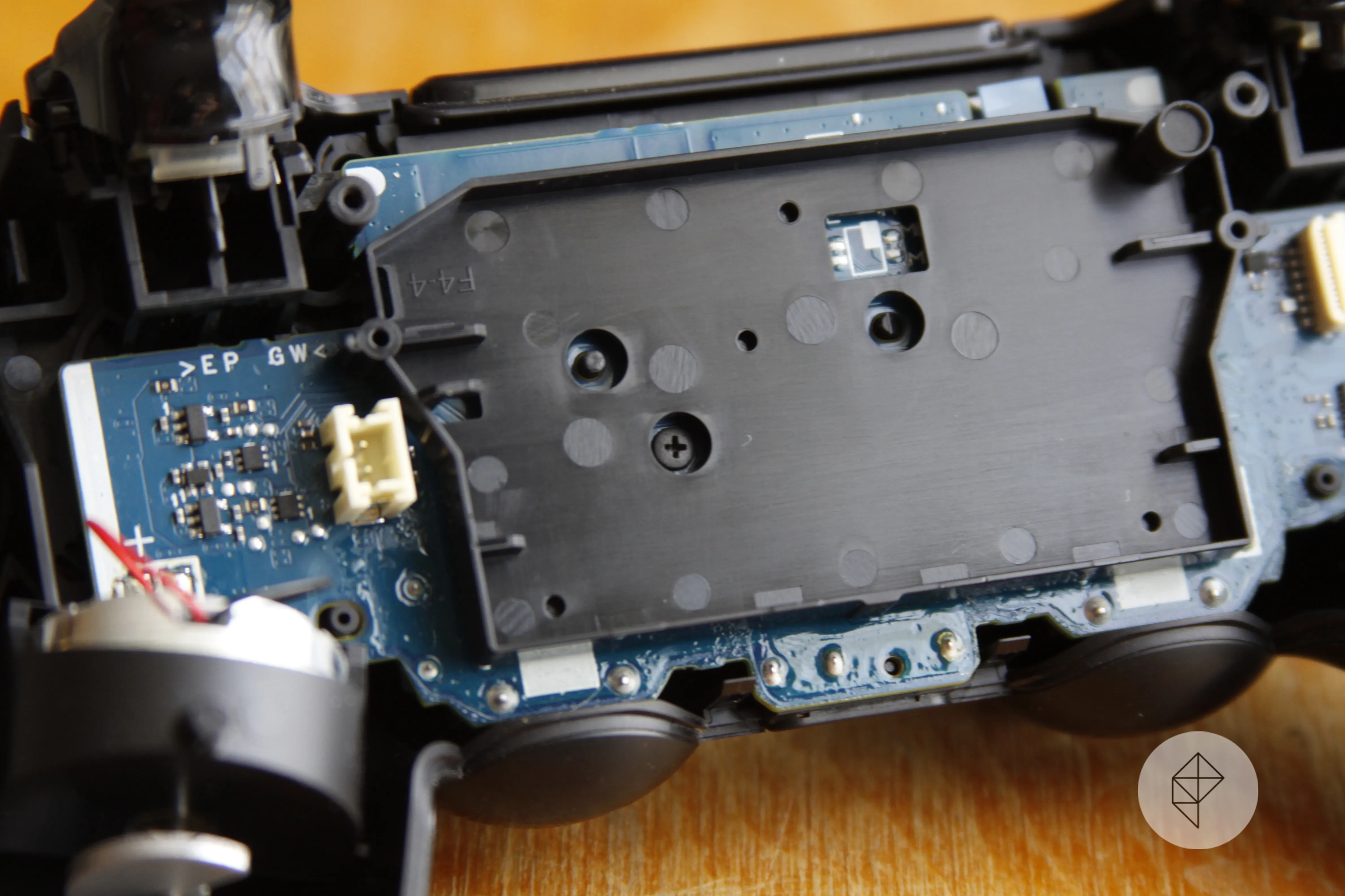 از برد اصلی دسته گرفته تا کلیدها و آنالوگها، حالا همه چیز دستهتان باید به بیرون بریزد. برد دسته را به سمت خودتان بکشید. حواستان باشد کابلهایی که به موتور ویبراتور وصل است، جدا نشوند.