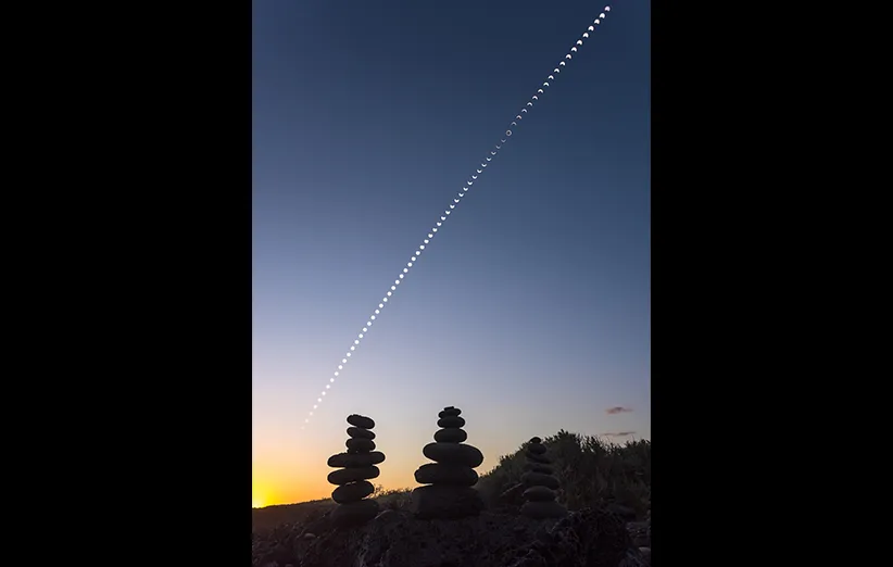 این تصویر حاصل ترکیب ۶۸ عکس است و به هنگام خورشیدگرفتگی ماه سپتامبر گرفته شده. عکاس از ساعت ۱۳ هر چهار دقیقه یک فریم ثبت کرده است. در این تصویر می‌بینید که چگونه ماه کم‌کم جلوی خورشید را می‌پوشاند و از جلوی آن کنار می‌رود تا خورشید در پس افق غروب کند. خورشید گرفتگی ماه سپتامبر یک کسوف اصطلاحا حلقوی بود. بدین معنی که ماه به طور کامل جلوی قرص خورشید را نپوشاند. این عکس در «جزیره‌ی ریونین» در اقیانوس آرام که در اختیار فرانسه است گرفته شده.