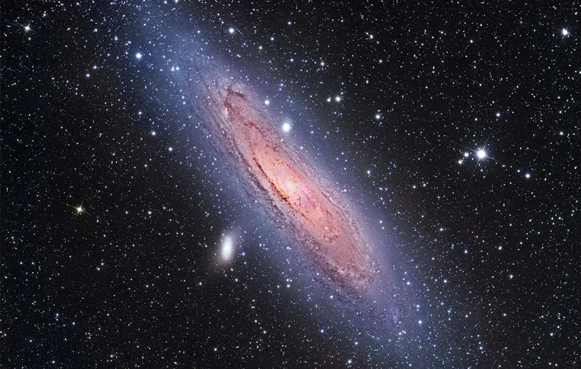 نزدیکترین کهکشان بزرگ به راهشیری کدام است؟ پاسخ مشخص است، کهکشان اندرومدا. در حقیقت اندرومدا خیلی شبیه به کهکشان راهشیری خودمان است. این دو کهکشان به همراه یکدیگر بر گروه کهکشانهای محلی مسلط شدهاند. نور محو اندرومدا بر اثر صدها میلیارد ستارهای که آن را تشکیل دادهاند ایجاد شده است. ستارههای خیلی زیادی که در اطراف کهکشان میبینید در حقیقت در پیشزمینه قرار دارند و جزو کهکشان خودمان هستند. اندرومدا را با نام M31 هم میشناسند چون ۳۱امین جرمی بود که شارل مسیه آن را در فهرست اجرام محوی که رصد کرده بود آورده است. M31 آنقدر دور است که حدود دو میلیون سال طول میکشد نور آن به ما برسد. هرچند که اندرومدا را با چشم غیر مسلح هم میتوان دید ولی عکس بالا تصویری موزاییکی است که با یک تلسکوپ کوچک گرفته شده. هنوز چیزهای زیادی دربارهی M31 نمیدانیم از جمله اینکه چند میلیارد سال دیگر به کهکشان ما برخورد میکند.