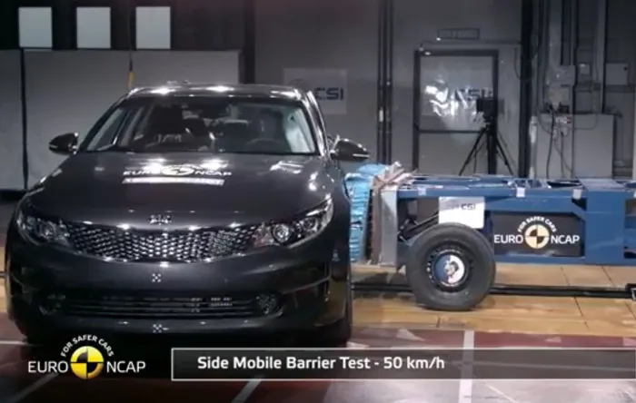 در تست تصادف از بغل، اپتیما باز هم سربلند از این آزمون بیرون درآمد؛ با وجود آسیب به ستون میانی (ستون B)، شاسی و بدنهی جانبی، آسیب کمی به دیگر بخشهای اتومبیل وارد میشود. این نشان میدهد که کیا اپتیما خودروی مقاوم و مستحکمی در تصادفات است. در گزارش یورو انکپ کیا اپتیما مدل 2015، وضعیت ایمنی سرنشین جلو کاملا سبز نشان داده شده است. بنابراین، پا، قفسهی سینه، شکم، سر و گردن راننده از آسیب ضربه مصون است.