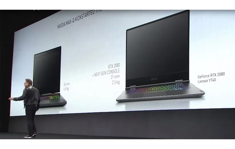 جنسن هانگ (Jensen Huang)، مدیرعامل و موسس شرکت انویدیا، در جریان کنفرانس اخیر، قدرت‌ کارت گرافیک RTX 2080 با طراحی Max-Q را به تصویر کشید. طراحی نسبتا جدیدی که به شرکت‌ها این امکان را می‌دهد لپ‌ تاپ‌هایی بسازند که در عین باریک بودن، قدرت پردازش گرافیکی‌شان حتی از قبل بیشتر است. برای اثبات این موضوع، هانگ در یکی از اسلاید‌ها، به مقایسه دو لپ تاپ لنوو Y900 با پردازنده گرافیکی GTX 980M و لنوو Y740 با گرافیک RTX 2080 Max-Q پرداخت.